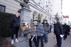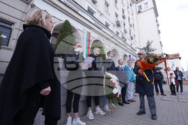 София (31 март 2022) Заместник министърът на младежта и спорта инж. Владимир Харизанов (трети от дясно наляво), ръководството и учениците от Спортно училище “ген. Владимир Стойчев” и представители на Съюза на ветераните от войните на България (СВВБ) поднесоха венец и цветя пред паметника на ген. Владимир Стойчев по повод 130 години от рождението на именития български военен, политически и спортен деец.