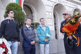 София (31 март 2022) Заместник министърът на младежта и спорта инж. Владимир Харизанов (втори от ляво надясно), ръководството и учениците от Спортно училище “ген. Владимир Стойчев” и представители на Съюза на ветераните от войните на България (СВВБ) поднесоха венец и цветя пред паметника на ген. Владимир Стойчев по повод 130 години от рождението на именития български военен, политически и спортен деец.