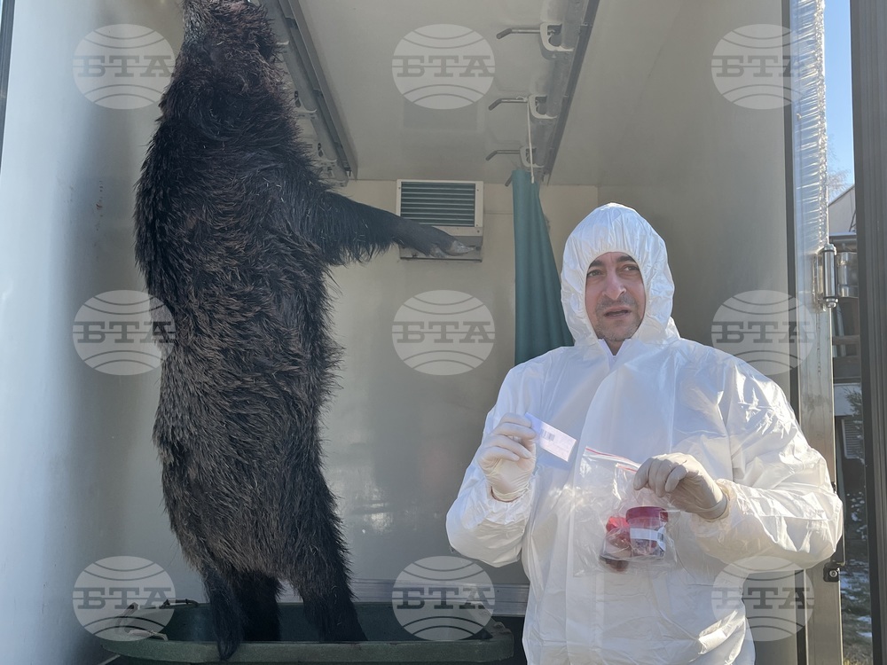 София (12 януари 2024) Заместник-министърът на земеделието и храните инж. Мирослав Маринов (в средата), изпълнителният директор на Българската агенция по безопасност на храните (БАБХ) д-р Светлозар Патарински (дясно) и главният експерт в дирекция "Здравеопазване на животните“ при БАБХ Даниел Денев (ляво), направиха демонстрация на вземане на проба за трихинелоза и Африканска чума по свинете (АЧС) от дива свиня на територията на Държавно ловно стопанство (ДЛС) "Витошко-Студена".