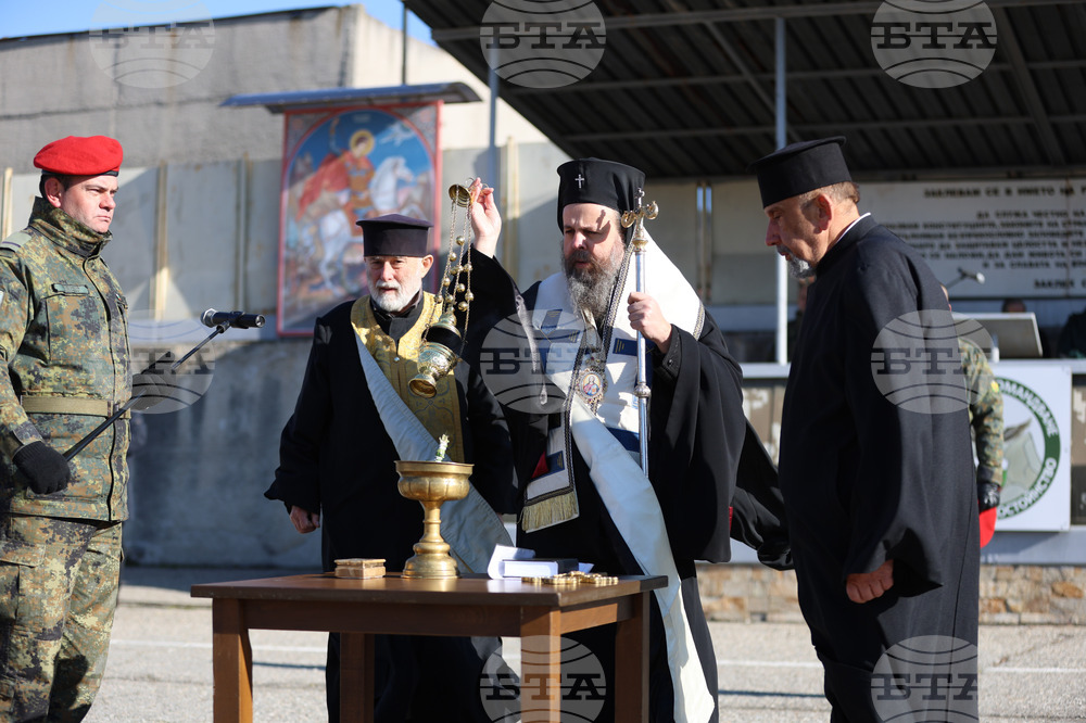 Благоевград (12 януари 2024) Новоназначени военнослужещи полагат военна клетва на тържествен ритуал на строевия плац на Трето бригадно командване в Благоевград. На снимката: Негово високопреосвещенство Неврокопски митрополит Серафим (в средата) и свещеници от благоевградския храм „Въведение Богородично“ отслужват водосвет за здраве и благоденствие на новопостъпилите служители и целия състав на Трето бригадно командване