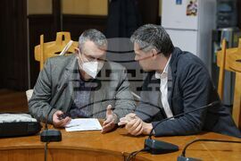 Бургас (30 януари 2024) Регионалният пандемичен щаб за борба с грип и остри респираторни заболявания провежда заседание относно мерките за ограничаване на заболеваемостта. Срещата се провежда в сградата на Областната управа. На снимката: кметът на Община Поморие Иван Алексиев (ляво) и зам.-директорът на УМБАЛ Бургас д-р Светлозар Георгиев (дясно).