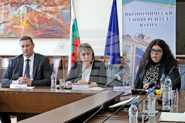 Варна (5 февруари 2024) Заместник-министърът на образованието и науката проф. д.ф.н. Генка Петрова-Ташкова взема участие в работната среща с ректори на висшите училища от Варна на тема - "На фокус - висшето образование във Варна". Форумът се провежда по инициатива на областния управител проф. Андрияна Андреева. На снимката (от ляво надясно): ректорът на ИУ Варна проф. Евгений Станимиров, заместник-министърът на образованието и науката проф. д.ф.н. Генка Петрова-Ташкова, областният управител проф. Андрияна Андреева.