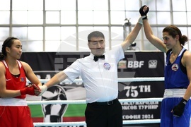 София (5 февруари 2024) Юбилейното 75-то издание на най-стария международен боксов турнир в Европа Купа "Странджа" се провежда в зала „София“. На снимката: боксова среща между Светлана Каменова и Номин-Ердене Тугсяргал (Молдова) в категория до 57 килограма.
