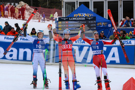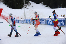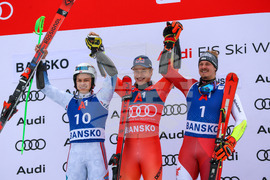 Банско (10 февруари 2024) На пистата "Бъндерица" се провежда втори манш от гигантския слалом за Световната купа по ски в Банско. На снимката: Александър Олсен (ляво), Марко Одермат (в средата), Мануел Фелер (дясно).