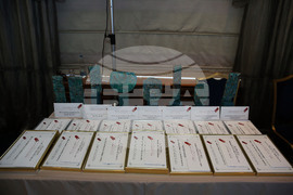 София (5 април 2022) Български форум на бизнес лидерите (БФБЛ) връчи Годишните награди за отговорен бизнес 2021 - национален конкурс за корпоративна социална отговорност и устойчиво развитие, който се провежда под мотото "Дай добър пример". На снимката: Николай Денков, министър на образованието и науката и Левон Хампарцумян (ляво), председател на БФБЛ..