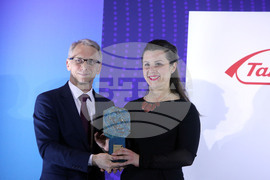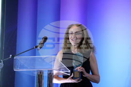 София (5 април 2022) Български форум на бизнес лидерите (БФБЛ) връчи Годишните награди за отговорен бизнес 2021 - национален конкурс за корпоративна социална отговорност и устойчиво развитие, който се провежда под мотото "Дай добър пример". На снимката: В категория „Най-добра социална политика на МСП” Даниел Лорер, министър на иновациите и растежа връчи наградата на Станимира Георгиева, директор бизнес развитие, Интерланг.
