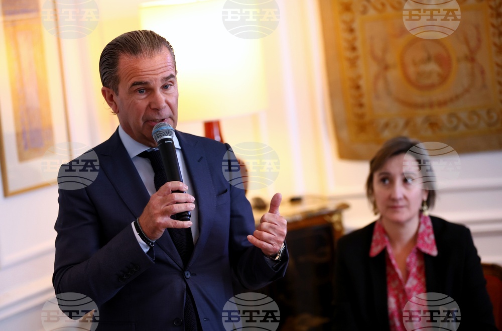 София (19 февруари 2024) Пресконференция по повод проучване на бизнес средата в България, съвместно разработено с агенцията за маркетингови проучвания "Ипсос", което е част от проекта "Бяла книга за България" на Френско-българската търговска и индустриална камара и Съветниците по външна търговия към посолството на Франция, се провежда в Посолството на Франция в България. На снимката: председателят на ФБТИК Стефан Делайе.