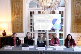 София (19 февруари 2024) Пресконференция по повод проучване на бизнес средата в България, съвместно разработено с агенцията за маркетингови проучвания "Ипсос", което е част от проекта "Бяла книга за България" на Френско-българската търговска и индустриална камара и Съветниците по външна търговия към посолството на Франция, се провежда в Посолството на Франция в България. На снимката (от ляво надясно): първият съветник Стефани Петибон, изпълнителният директор на Ипсос Ива Димова, Михаела Георгиева - Ипсос, изпълнителният директор на Групама застраховане Селин Болар, директорът на ФБТИК, Весела Мозетиг.