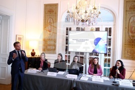 София (19 февруари 2024) Пресконференция по повод проучване на бизнес средата в България, съвместно разработено с агенцията за маркетингови проучвания "Ипсос", което е част от проекта "Бяла книга за България" на Френско-българската търговска и индустриална камара и Съветниците по външна търговия към посолството на Франция, се провежда в Посолството на Франция в България. На снимката: първият съветник Стефани Петибон.