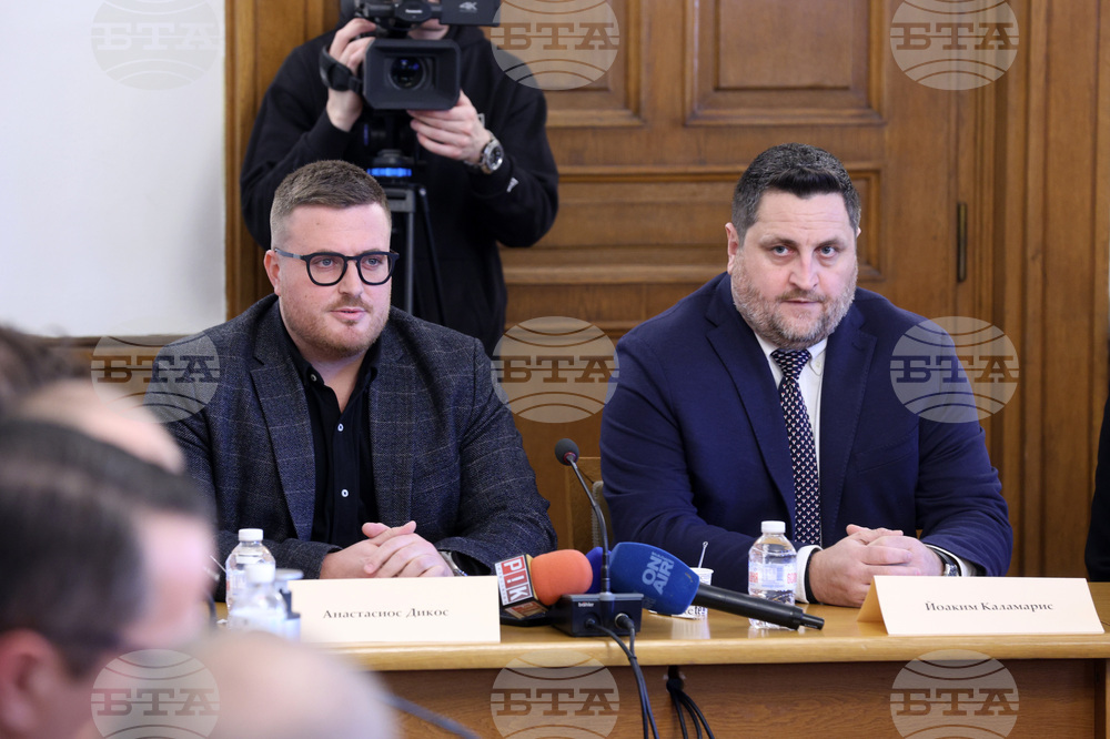 София (22 февруари 2024) Временната комисия за проверка на факти и обстоятелства, свързани с дейността на групата около Мартин Божанов провежда заседание в сградата на Народното Събрание. На снимката (от ляво надясно): бизнесмените Анастасиос Дикос, Йоаким Каламарис.