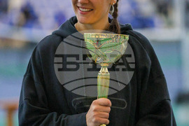 Благоевград (25 февруари 2024) В залата за тенис на Югозападен университет "Неофит Рилски" в Благоевград се играят финалите от Държавното лично първенство по тенис на закрито (мъже и жени). На снимката: заместник-кметът по култура, спорт и туризъм Станислав Кимчев (ляво), победителката при жените Джулия Терзийска (дясно).