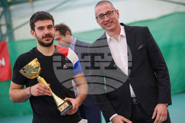 Благоевград (25 февруари 2024) В залата за тенис на Югозападен университет "Неофит Рилски" в Благоевград се играят финалите от Държавното лично първенство по тенис на закрито (мъже и жени). На снимката: победителят при мъжете Пламен Милушев (ляво), заместник-кметът по култура, спорт и туризъм Станислав Кимчев (дясно).