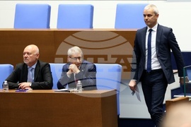 София (29 февруари 2024) Парламентът провежда редовно заседание в сградата на Народното събрание. На снимката (от ляво надясно): председателят на "Възраждане" Костадин Костадинов, министърът на отбраната Тодор Тагарев, министър-председателят Николай Денков.