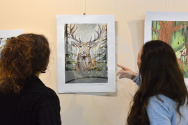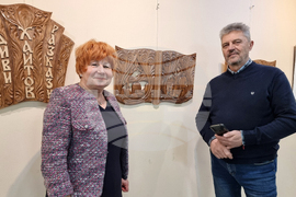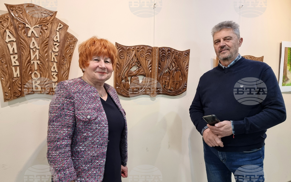 Варна (12 март 2024) С изложба на рисунки и дърворезби започват празниците по отбелязването на 100-годишнината на Професионалната гимназия по горско стопанство и дървообработване „Николай Хайтов“ във Варна. Откриването на експозицията в Арт салона на Радио Варна е тази вечер. На снимката: директорката на гимназията Мария Георгиева и Здравец Хайтов.