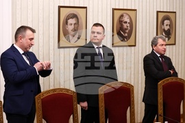 София (12 март 2024) Президентът провежда консултации с парламентарните сили в 49-ото Народно събрание за съставяне на правителство. Държавният глава приема представители на парламентарната група на „Има такъв народ“ (ИТН). На снимката (от ляво надясно): зам.-председателят на ПГ на ИТН Ивайло Вълчев, секретарят на политическата група на ИТН Станислав Балабанов, председателят на ПГ на ИТН Тошко Йорданов.