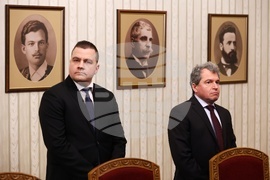 София (12 март 2024) Президентът Румен Радев провежда консултации с парламентарните сили в 49-ото Народно събрание за съставяне на правителство. Държавният глава приема представители на парламентарната група на „Има такъв народ“ (ИТН). На снимката (от ляво надясно): секретарят на политическата група на ИТН Станислав Балабанов, председателят на ПГ на ИТН Тошко Йорданов.