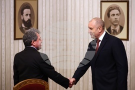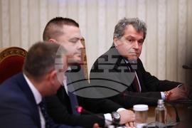 София (12 март 2024) Президентът Румен Радев провежда консултации с парламентарните сили в 49-ото Народно събрание за съставяне на правителство. Държавният глава приема представители на парламентарната група на „Има такъв народ“ (ИТН). На снимката (от ляво надясно): секретарят на политическата група на ИТН Станислав Балабанов, Румен Радев.