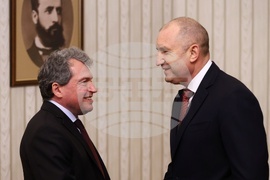 София (12 март 2024) Президентът Румен Радев провежда консултации с парламентарните сили в 49-ото Народно събрание за съставяне на правителство. Държавният глава приема представители на парламентарната група на „Има такъв народ“ (ИТН). На снимката (от ляво надясно): председателят на ПГ на ИТН Тошко Йорданов, Румен Радев.