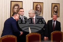 София (12 март 2024) Президентът Румен Радев провежда консултации с парламентарните сили в 49-ото Народно събрание за съставяне на правителство. Държавният глава приема представители на парламентарната група на „Има такъв народ“ (ИТН). На снимката (от ляво надясно): зам.-председателят на ПГ на ИТН Ивайло Вълчев, секретарят на политическата група на ИТН Станислав Балабанов, Румен Радев, председателят на ПГ на ИТН Тошко Йорданов.