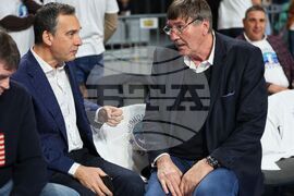 Бургас (17 март 2024) В спортна зала "Арена Бургас" се провежда баскетболна среща между отбора на Черноморец и отбора на Спартак Плевен. Мачът е финал от турнира за efbet Купата на България по баскетбол за мъже. На снимката: кметът на Община Бургас Димитър Николов (ляво) и председателят на Българската федерация по баскетбол Георги Глушков (дясно).