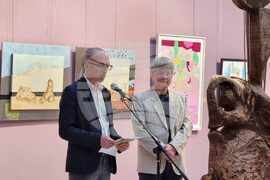 Кюстендил (20 март 2024) Изложба с най-новите творби на кюстендилските художници се открива тази вечер в художествената галерия „Владимир Димитров-Майстора“ в Кюстендил. Те са подредени в традиционната изложба „Кюстендилска пролет“, която е част от честването на празника на града, който се отбелязва на 21 март. Изложбата се реализира с финансовата подкрепа на Община Кюстендил и Съюза на българските художници, а съорганизатор е групата на художниците в града. В експозицията са включени произведения на 37 автори. Гости на изложбата са депутатът Георги Стамов, кметът на Кюстендил Огнян Атанасов и заместниците му. На откриването на изложбата присъства и генералният директор на БТА Кирил Вълчев. По време на изложбата наградиха млади автори – първа, втора и трета награда получиха Бисер Лапев, Теодора Сърбинска и Тома Тодоров. Най-възрастният автор, представен в изложбата, е Асен Динев на 89 години. На снимката: председателят на групата на художниците Владимир Шунев (вляво), директорът на галерията Валентин Господинов (вдясно).