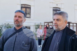 Сливен (23 март 2024) Отец Иван Янков (ляво) от храма "Света Троица" обяви, че прекратява гладната си стачка срещу касирания избор на Сливенски митрополит на Благовещение. Той направи изявлението си пред журналисти, докато отиваше към катедралния храм "Свети Димитър" да вземе причастие и в момент, в който отец Силвестър Янакиев (дясно) бе интервюиран, представяйки своята позиция относно касирането на изборите. Двамата се прегърнаха публично, въпреки различните си позиции.