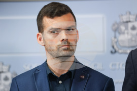 София (26 март 2024) Председателят на групата на ПП-ДБ-СС в градския парламент Борис Бонев, районният кмет на „Илинден“ Емил Бранчевски (на снимката) и общинският съветник Христо Копаранов дават брифинг във връзка с извършено киберпрестъпление срещу кмета Бранчевски.