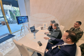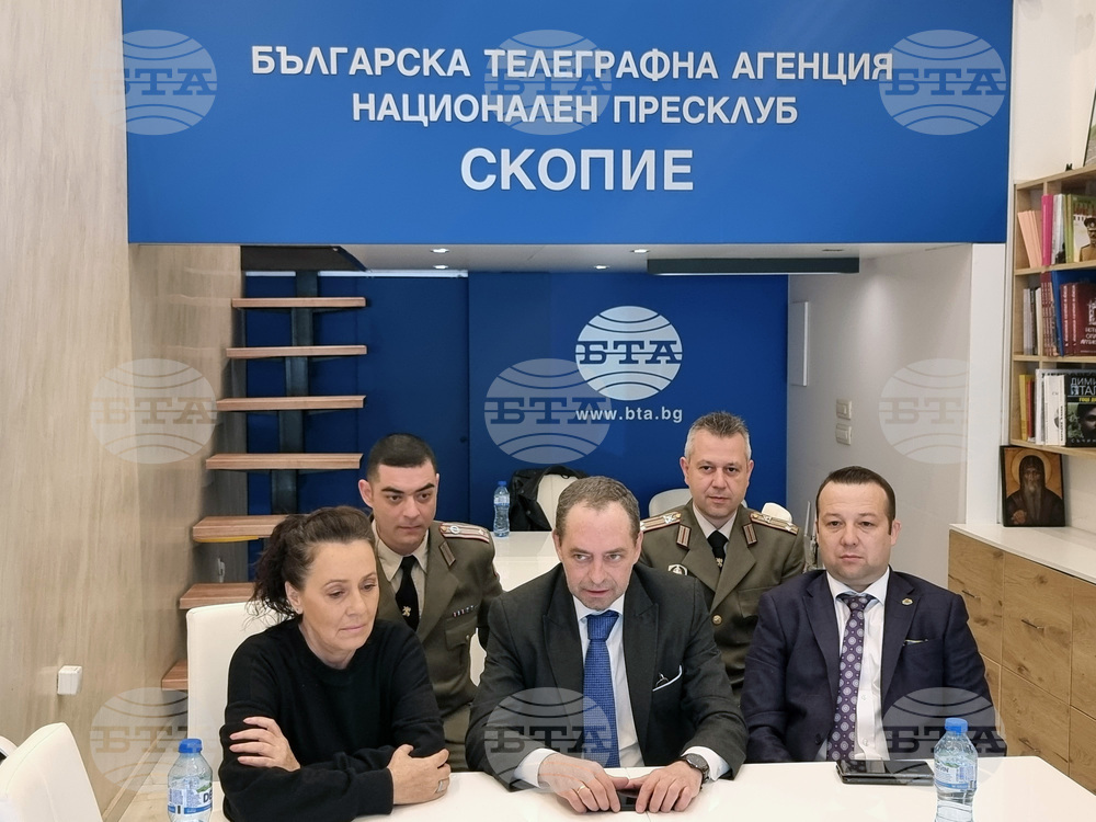 Скопие (29 март 2024) В Националния пресклуб на БТА - Скопие и всички тридесет и пет Национални пресклубове в цяла България и в чужбина, официално се открива изложбата „75 години НАТО и 20 години България в НАТО“. Експозицията разкрива в кадри и документи ключови исторически моменти, съхранени в архивния фонд на БТА. В националните пресклубове на БТА извън София изложбата е представена в дигитален вариант. В представянето и в Скопие участват посланикът на България в Република Северна Македония Ангел Ангелов (в средата), пълномощният министър (Политически въпроси) в Посолството на България в Северна Македония Петьо Вълков (вдясно), майор Диан Динев (втори отляво, на заден план), част от военната мисия на България при посолството в Северна Македония, подполковник Асен Ламбов (втори отдясно, на заден план).