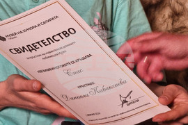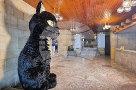 Габрово (1 април 2024) Днес на рождения ден на Музея на хумора и сатирата бе кръстено #безименното коте, което посреща посетителите в културната институция. Спас е изправена котка, а фигурата е с височина 2,5 м. и е създадена от Невена Екимова. Свидетелство за кръстник на новия пухкав домашен любимец на Музея бе връчено на Даниела Кабакчиева (на снимката) от музейната управа.