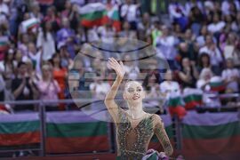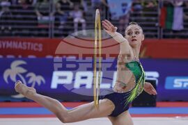 София (14 април 2024) В зала "Арена София" се провеждат финали на Световната купа по художествена гимнастика. На снимката: Боряна Калейн съчетание с обръч.
