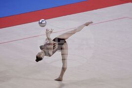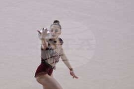 София (14 април 2024) В зала "Арена София" се провеждат финали на Световната купа по художествена гимнастика. На снимката: Боряна Калейн съчетание с топка.