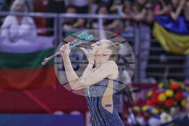 София (14 април 2024) В зала "Арена София" се провеждат финали на Световната купа по художествена гимнастика. На снимката: Боряна Калейн съчетание с бухалки.