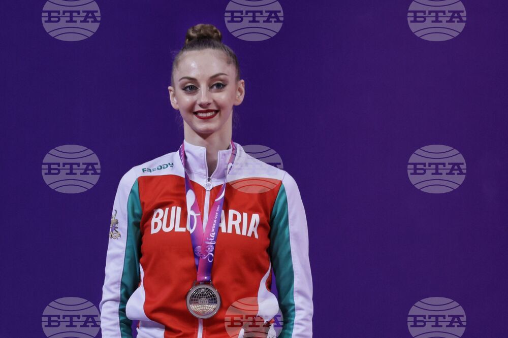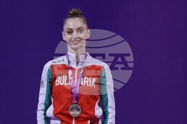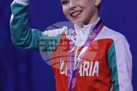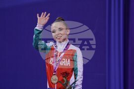 София (14 април 2024) В зала "Арена София" се провеждат финали на Световната купа по художествена гимнастика. На снимката: златен медал за Стилияна Николова във финала на топка. Сребърен медал за Тахмина Икромова от Узбекистан и бронз за Дария Атаманов, Израел.