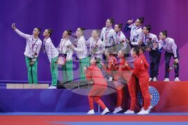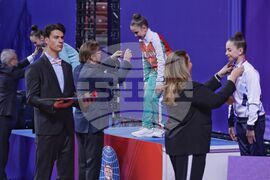 София (14 април 2024) В зала "Арена София" се провеждат финали на Световната купа по художествена гимнастика. На снимката: награждаване на ансамблите за съчетание с пет обръча. Първо място зае ансамбълът на Израел, второ за Испания и трето за Мексико.