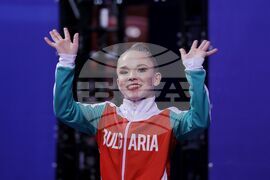 София (14 април 2024) В зала "Арена София" се провеждат финали на Световната купа по художествена гимнастика. На снимката: златен медал за Стилияна Николова във финала на топка..