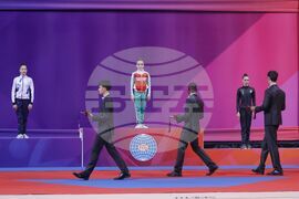 София (14 април 2024) В зала "Арена София" се провеждат финали на Световната купа по художествена гимнастика. На снимката: Боряна Калейн взе сребро на бухалки. победител е СофияРафаели (Италия), а трета Виктория Оноприенко (Украйна).