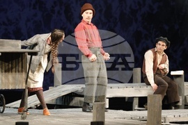 Русе (17 април 2024) Русенският драматичен театър "Сава Огнянов" представя на публиката новия си спектакъл "Куцльото от забутания остров" от Мартин Макдона. Режисьор на постановката е Пламен Марков. Премиерата на спектакъла е на 21 април, на Голяма сцена на Доходното здание в Русе. На снимката: актьорите Кадри Хабил, Тодор Лазаров (дясно) и Ивана Керанова.