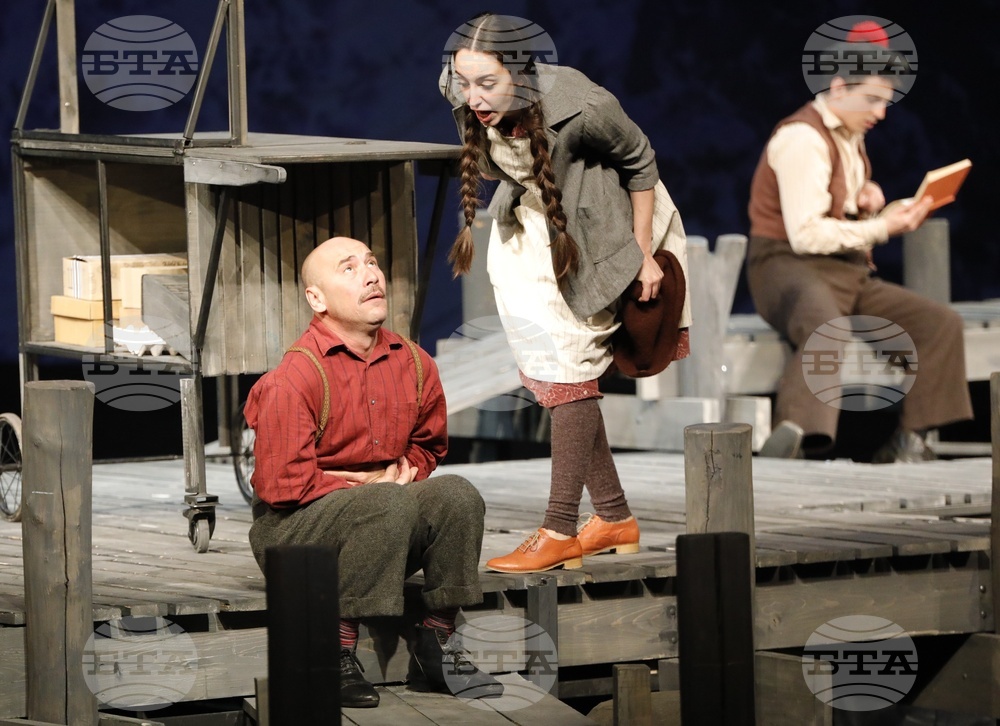 Русе (17 април 2024) Русенският драматичен театър "Сава Огнянов" представя на публиката новия си спектакъл "Куцльото от забутания остров" от Мартин Макдона. Режисьор на постановката е Пламен Марков. Премиерата на спектакъла е на 21 април, на Голяма сцена на Доходното здание в Русе. На снимката: актьорите Кадри Хабил (дясно), Тодор Лазаров и Ивана Керанова.