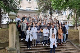 Скопие (18 април 2024) Протест в Клиничния център на лекари - специализанти в Северна Македония, които настояват за увеличаване на месечното им възнаграждение до нивото на средната заплата на лекар в обществено здравно заведение. На снимката: членът на координиращия орган на лекари-специализанти Христина Илиоска Чешлароска (в средата, на преден план).