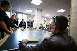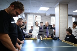 София (18 април 2024) Събитие по повод Деня на Земята - 22 април се провежда в Центъра за психологически изследвания. Специален фокус е поставен върху състезание по адаптиран крикет. Организатор на събитието е ръководителят на Центъра за психологически изследвания д-р Диана Инджова. На снимката: младежи със специални потребности преподават урок по адаптиран крикет на посланика на САЩ Кенет Мертен (трети отдясно) и на обществени личности, които подкрепят каузата на хората с увреждания.