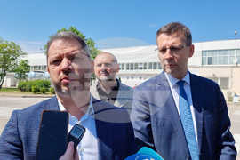 Козлодуй (20 април 2024) Служебният министър-председател и служебният министър на енергетиката са на посещение в Атомната електроцентрала „Козлодуй“, където днес пристигна първата доставка на ядрено гориво от компанията „Уестингхаус“. На снимката: народният представител от ГЕРБ-СДС Делян Добрев (вляво), народният представител от ДПС Станислав Анастасов (вдясно).