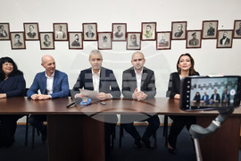 Варна (27 април 2024 година) На пресконференция във Варна партия "Възраждане" представи листата си за народни представители в Трети многомандатен избирателен район. На снимката (от ляво надясно): кандидатите за народни представители от листата на „Възраждане“ във Варна - Полина Костадинова, Коста Стоянов, председателят на партия Костадин Костадинов, Юлиян Губатов и Михаела Берова-Зекова.