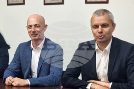 Варна (27 април 2024 година) На пресконференция във Варна партия "Възраждане" представи листата си за народни представители в Трети многомандатен избирателен район. На снимката: депутатът от „Възраждане" Коста Стоянов и председателят на партията Костадин Костадинов (дясно).