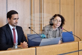 София (7 май 2024) В Столичната община се провежда пресконференция по повод организацията на движение за фестивала на светлините Лунар (LUNAR), който ще се състои от 9 до 12 май. На снимката (от ляво надясно): заместник-кметът по транспорт Илиян Павлов и заместник-кметът по култура Яна Генова.