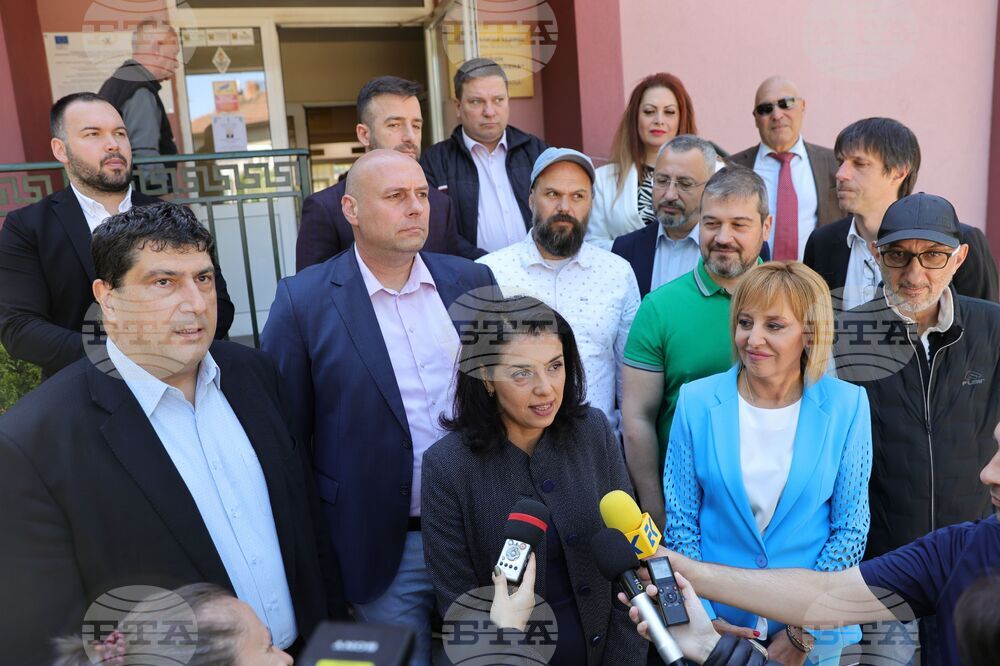 София (7 май 2024) Пред сградата на район „Красна поляна“ - РИК 25, председателят на коалиция „Солидарна България“ Ваня Григорова (ляво) и председателят на "Изправи се България " Мая Манолова (дясно) представят водачите на трите листи в София.
