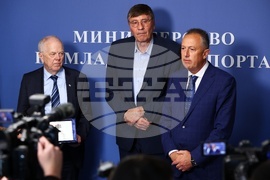София (10 май 2024) Президентът на Международния съюз по биатлон Оле Далин (вляво) и президентът на Българската федерация по биатлон Атанас Фурнаджиев (вдясно) говорят пред медиите след срещите си с президента Румен Радев и със спортния министър Георги Глушков (в средата). Пресконференцията се провежда в Министерството на младежта и спорта.