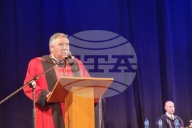 Стара Загора (17 май 2024) На тържествена церемония днес в залата на Културен център "Стара Загора" Ветеринарномедицински факултет на Тракийски университет изпрати своите абсолвенти. Тази година се дипломират общо 127 абсолвенти, от които 116 ветеринарни лекари от България, Великобритания, Гърция, Ирландия, Канада и Кипър, както и 11 магистри по магистърската програма „Интегрирани системи за управление качеството и безопасността на храните“. На снимката: ректорът на Тракийски университет проф. д-р. Добри Ярков.