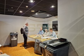 Хага (6 юни 2024) Нидерландия гласува днес на евроизборите, първа сред страните от Европейския съюз. Нидерландците ще изпратят 31 депутати в новия 720-местен Европейски парламент. За участие са регистрирани рекорден брой партии и кандидати: 20 партии от почти целия политически спектър и 497 кандидати. Гласуването по традиция започва в 7,30 сутринта, но секции на гарите отвориха по-рано, тъй като много хора минават оттам на път за работа или учене. След 21 часа, когато ще приключи гласуването, ще стана известни първите екзит-полове. На снимката: секцията в Дома на Европа. Лишье Шрейнемахер (вляво), служебен министър на външната търговия и развитието дава интервю за нидерландското радио БНР.
