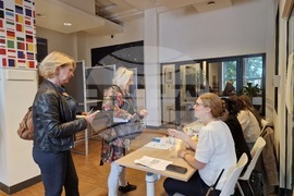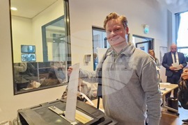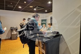 Хага (6 юни 2024) Нидерландия гласува днес на евроизборите, първа сред страните от Европейския съюз. Нидерландците ще изпратят 31 депутати в новия 720-местен Европейски парламент. За участие са регистрирани рекорден брой партии и кандидати: 20 партии от почти целия политически спектър и 497 кандидати. Гласуването по традиция започва в 7,30 сутринта, но секции на гарите отвориха по-рано, тъй като много хора минават оттам на път за работа или учене. След 21 часа, когато ще приключи гласуването, ще стана известни първите екзит-полове. На снимката: избирателната секция в Дома на Европа, където гласуват и нидерландски политици. Гласува Лишье Шрейнемахер (вляво), служебен министър на външната търговия и развитието.