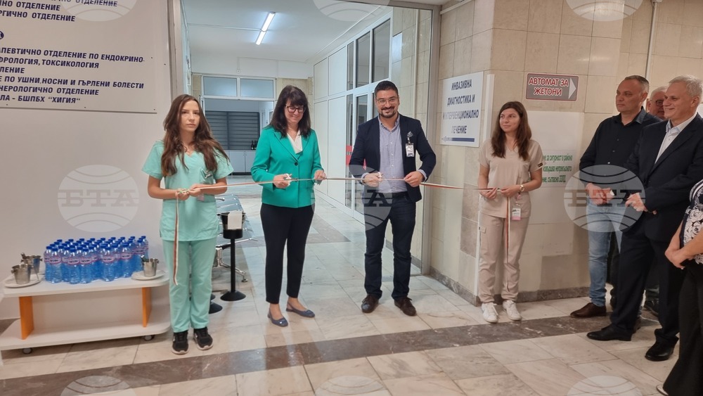 Добрич (14 юни 2024) Служебният министър на здравеопазването д-р Галя Кондева и директорът на Многопрофилна болница за активно лечение - Добрич АД д-р Георги Желязков прерязаха лентата на новия графично-скопичен рентгенов апарат, който ще служи за по-добра образна диагностика в лечебното заведение. На снимката (от ляво надясно): заместник-директорът „Медицински дейности“ на болницата д-р Светла Илиева, началникът на кабинета на Министерство на здравеопазването Теодора Табакова, завеждащият отделението по рентгенология в болницата д-р Валентин Димитров, служебният министър на здравеопазването д-р Галя Кондева и директорът на болницата д-р Георги Желязков.
